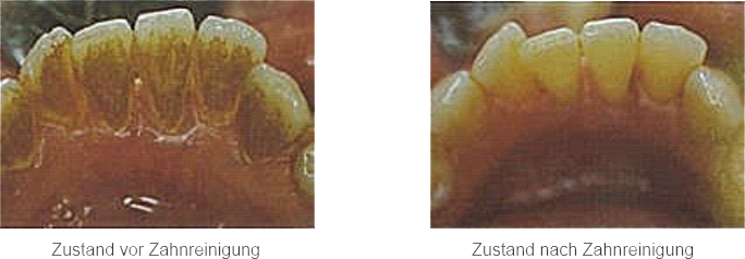 Ob Sie bei diesen Kontrollen nur die einfache Zahnsteinentfernung auf Kassenkosten (jährlich einmalig) wählen oder ob Sie eine gründliche Zahnreinigung mit Entfernung aller Farbbeläge und Politur der Zahnoberflächen bevorzugen, überlassen wir Ihrer Entscheidung.
